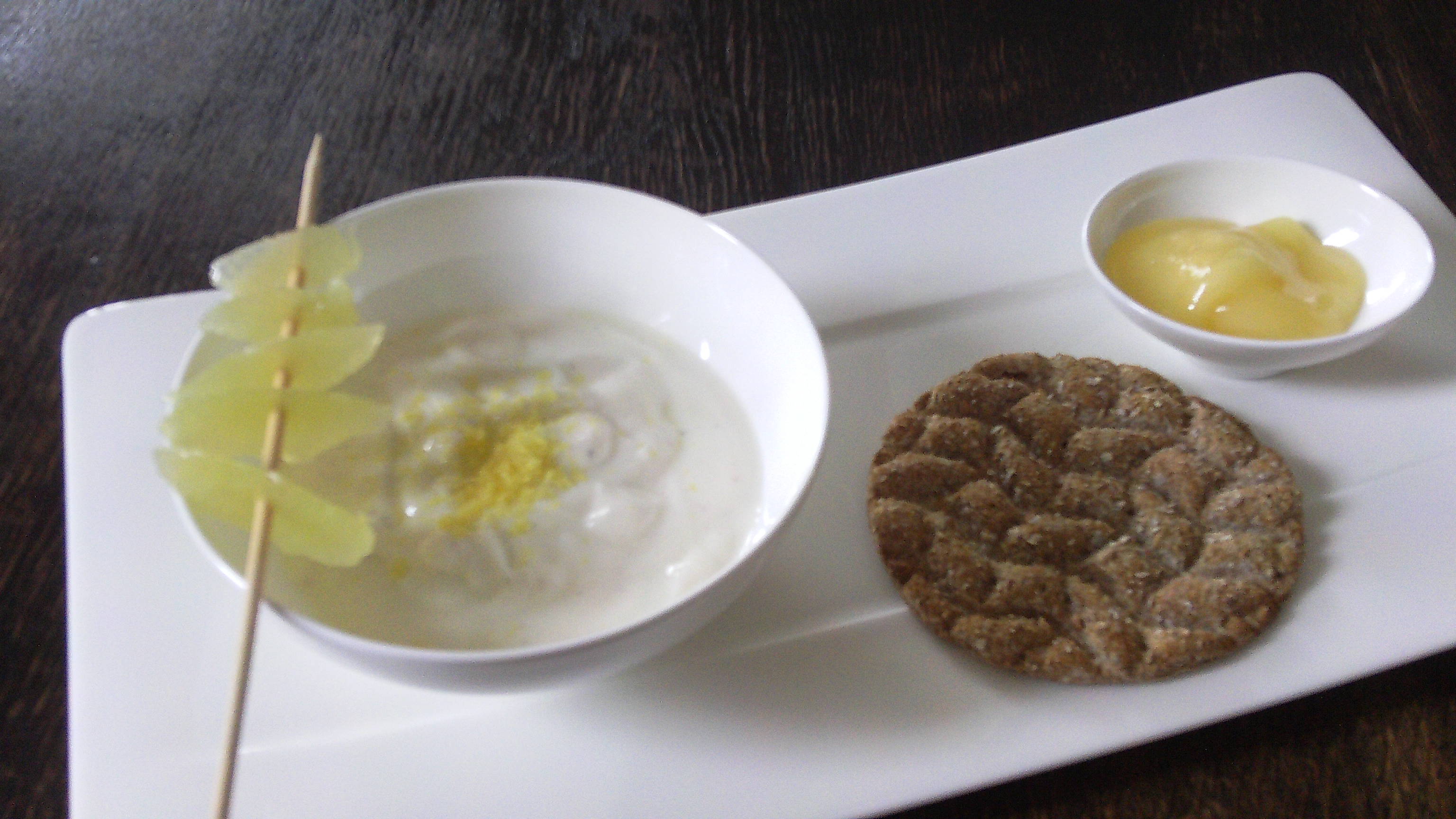 > Yellow Vanillejoghurt mit Raspeln der Zitronenschale und Zitronenfilets, Lindenhonig, Knäckebrot
