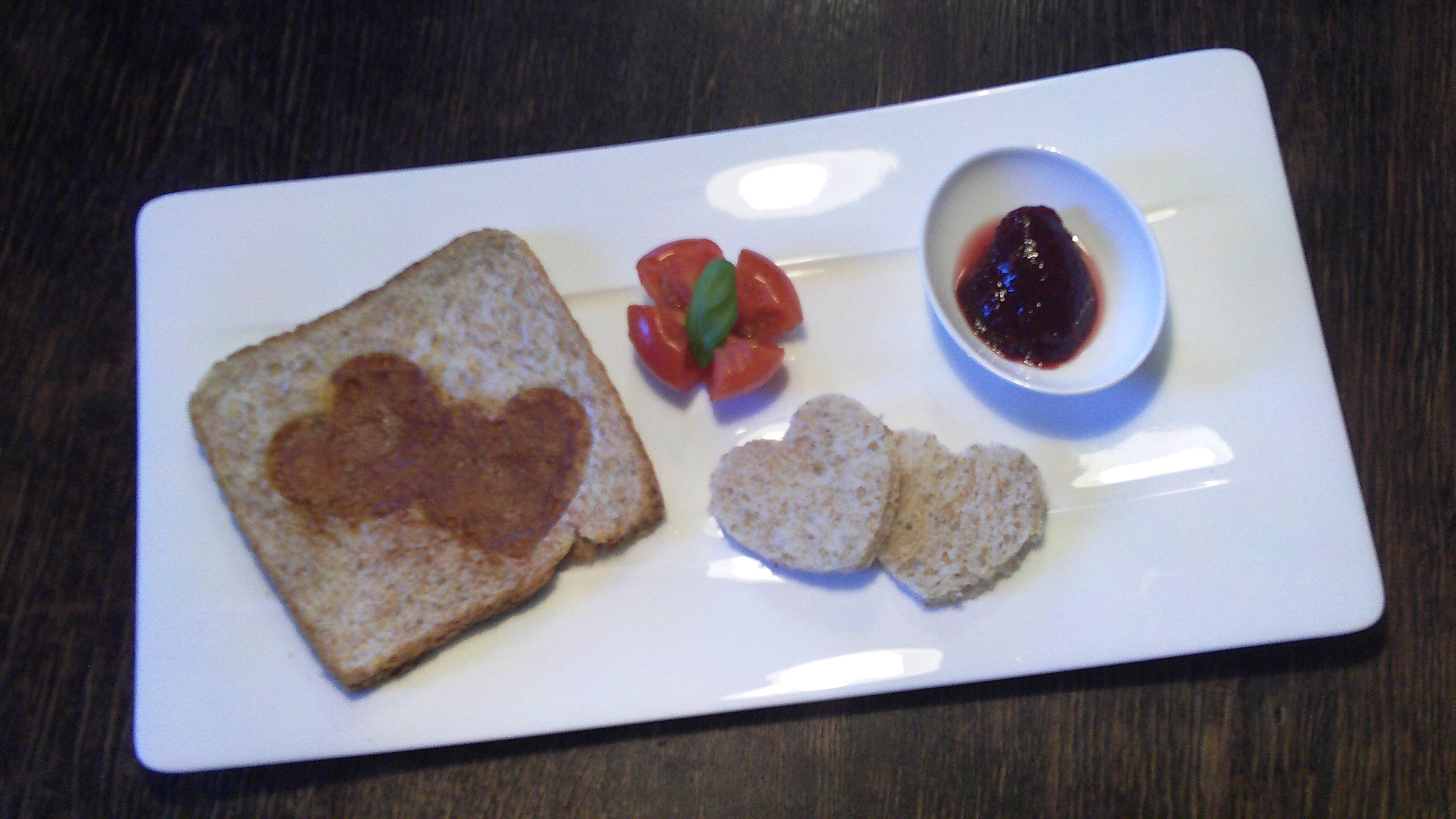 > ORANGE > RED Joghurt mit Orangenfilets, Vollkorntoast mit Kräuterquark verrührt mit "Zwei Herzen"-Paprikaei, Apfel-Kürbis-Marmelade, Tomate, Himbeermar- Knäckebrot, Physalis melade